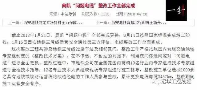 截止2018年1月24日,奥凯“问题电缆”全部完成更换;3月14日按照国家标准完成竣工验收;4月16日西安地铁三号线运营安全通过第三方评估,电缆整改工作全面完成。