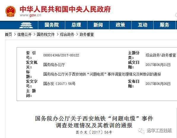 2018年6月,中国政府网微信公号发布消息,国务院决定对西安地铁“问题电缆”事件严厉问责,包括责成陕西省政府向国务院作出深刻书面检查,逮捕八名违法生产企业人员,问责处理地方职能部门122名责任人,包括16名厅级官员,58处级官员;对中央企业驻陕单位19名涉案人员立案侦查等。