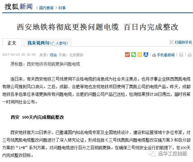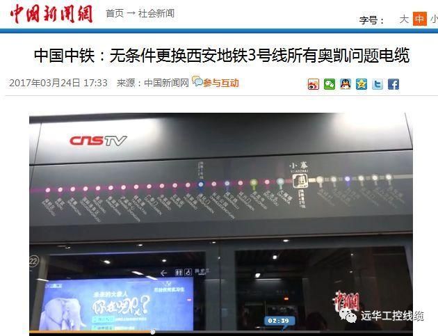 西安地铁三号线问题电缆事件发生后,作为地铁施工单位,2017年3月24日,中国中铁新闻发言人代表公司所属使用奥凯电缆的参建单位承诺: